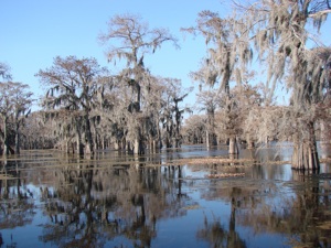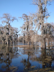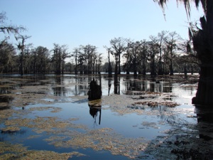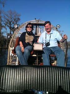 O.k. Take a swig of beer and fill your mouth with popcorn and say this word... ATCHAFALAYA. That’s the name of the basin just outside of Lafayette where we took a 2 hour airboat ride in the swamp. It’s the largest swamp in the United States and we happened to get there on a warm winter day, low 70’s, just a couple of hours before sunset. We asked about rides and the operator said he normally took 6 to a boat but if we wanted to go it was such a beautiful day that he’d take us. In fact, since it was the end of the day he thought he’d take his normal route through the swamp the opposite direction of that he usually did so that we would be in the Cypress Forest during sunset.